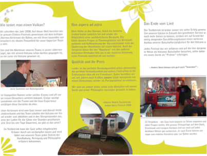 Technik: Der Volcano hat ein bahnbrechendes und solides Design, ist den meisten anderen Vaporizern in Punkto Effizienz überlegen und hat von allen den besten Support (Händler&Kunden). Ausserdem besticht er durch seine gute Verarbeitung eben auch bei den Verschleissteilen, sie sind schlicht kaum vorhanden. Die eingebaute Hochleistungsheizpatrone und die Mebranpumpe sind so verbaut , das eine besondere Langlebigkeit gewährleistet wird. Das sagt nicht nur der Hersteller, sondern auch unsere seit sechs Jahren dauernd wiederholte Festivaltestreihe. Eine unabhängige Temperatursicherung, Luftfilter und Schalldämpfer, ein speziell konsturierter Aluminiumheizblock der die Luft sauber und zuverlässig auf die gewünschte Temperatur bringt runden das hervorragende Testergebnis ab.