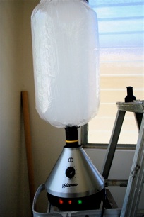 Etwa 3 Minuten werden benötigt, danach hat der Volcano die eingestellte Temperatur erreicht und die Kräuterkammer kann auf den Volcano gestellt werden. Beim aufstecken den Auffangsack spürbar einklicken lassen. Im nächsten Schritt schaltet Mensch das Gebläse ein, der Sack füllt sich mit Dampf.
